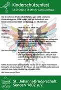 Am 13.09.2025 findet im Alten Zollhaus unser diessjähriges Kinderschützentzenfest statt. Alle Infos findet ihr auf dem Plakat.